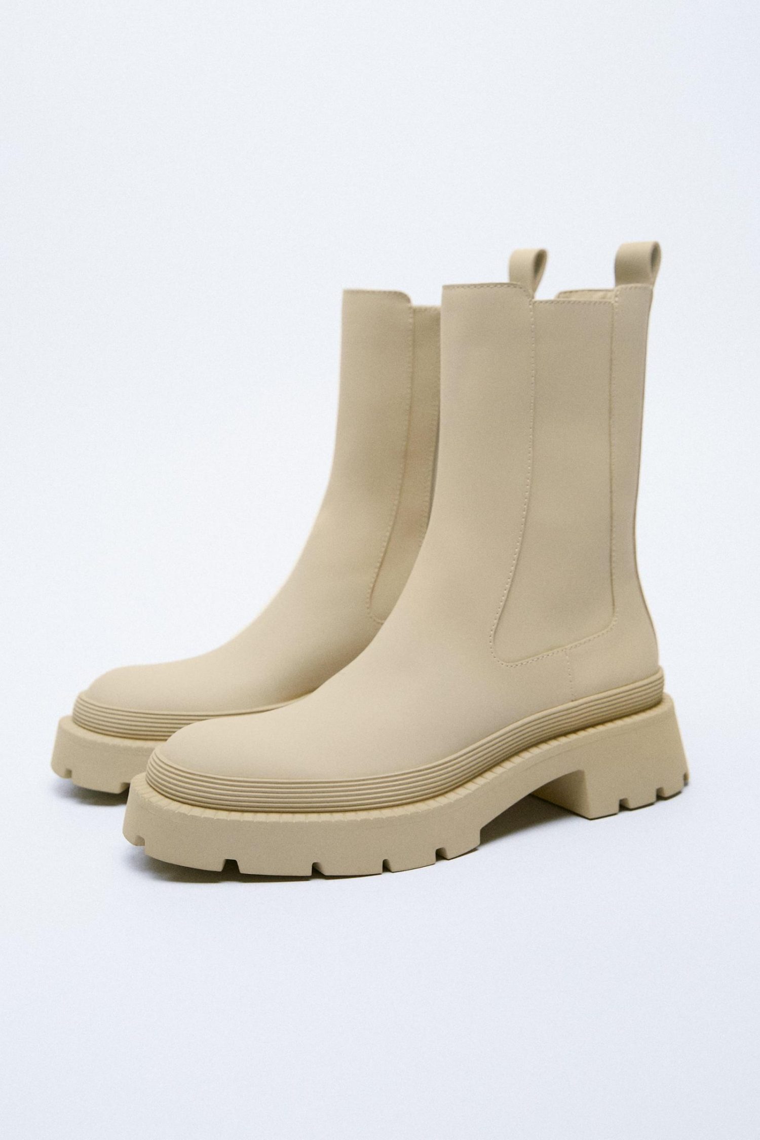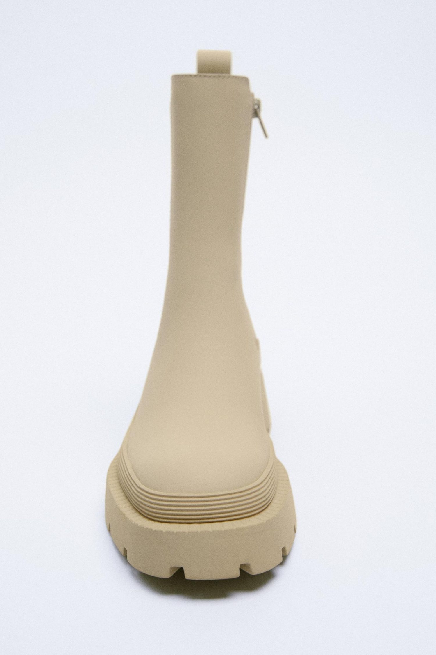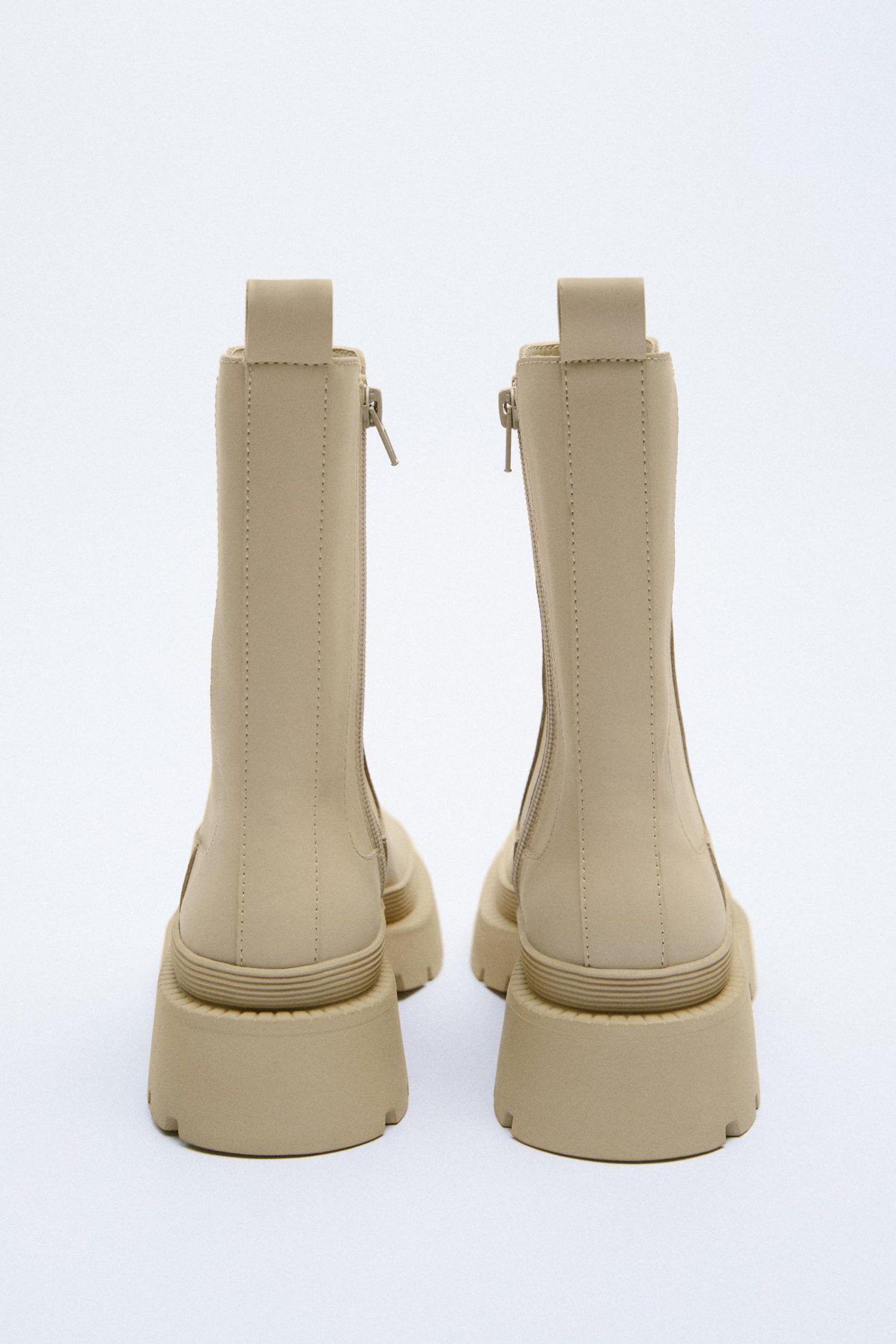 Zapato tipo botín engomado. Detalle de pespuntes y tirador trasero. Suela track. Cierre mediante cremallera.